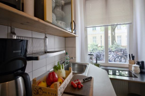 In einem vor Lärm geschützten und begrünten Hinterhof an der berühmten Ecke der Schönhauser Allee, wo die Ostberliner Straßenbahnen die U-Bahn unterqueren und die bunte Kastanienallee mit ihren hippen Läden und Cafés in den ruhigeren Teil der Pappelallee übergeht, liegt diese gemütliche Wohnung im Erdgeschoss eines Seitenflügels. Eine Küche mit Sitzgelegenheit, ein Bad mit Badewanne, ein Schlaf- sowie ein Wohnzimmer, in dem zusätzlich bis zu drei Personen auf Schlafmöbeln komfortabel übernachten können, machen die Wohnung mit ihren extrem hohen Decken, großen Fenstern zum Hof und kleinen Reminiszenzen an die 70er Jahre zu einer entspannenden Rückzugsmöglichkeit nach ereignisreichen Ausflügen ins Großstadtleben.