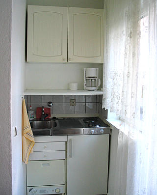 modern möbliertes Apartment, Kleinküche mit Kühlschrank, Kochplatten, Kaffeemaschiene, inkl. Geschirr und Besteck, Kabel-TV inkl. Bettwäsche und Handtücher. Kleiderkammer, modernes Bad. Auf Wunsch mit Kinderbett.